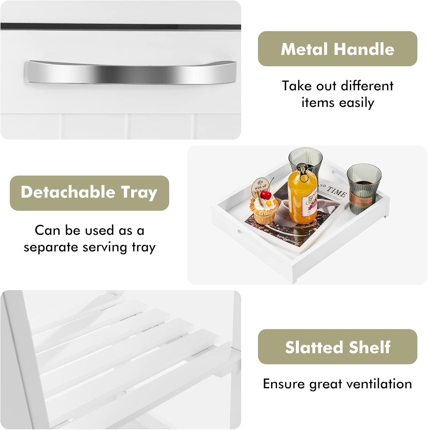 Description:Add the rolling island cart to your kitchen!The solid wood structure ensures a strong load capacity and is also painted for good water resistance. Overall, the kitchen island cart has a wide countertop, 3 drawers and 3 shelves, so storage it offered is ample for daily needs. More, drawers and shelves can be placed in different positions for your preference. The tray is removable for flexible applications. Plus, the serving cart comes with 4 universe steel casters, including 2 lockable, for easy movement. Finally, it only requires simple assembly and is suitable for various occasions.Features:Ample storage with wide countertop, 3 large drawers and 3 open shelvesFlexible placement of drawers and shelves to customize the storage freelyRemovable tray for individual application and easy cleaningStructure made of solid wood with great sturdiness and durability4 universal steel casters for easy movement (2 of them are lockable)Functional handles effortless to open and close drawersSmooth surface without burrs won’t scratch people accidentallyModern design suitable for different home decorationsApplicable to living room, dining room, kitchen and moreSpecifications:Color: BlackMaterial: Rubber Wood, Pine Wood, MDF, SteelOverall Dimension: 26.5” x 14.5” x 33” (L x W x H)Weight Capacity of Tabletop: 44lbsWeight Capacity of Each Shelf: 22lbsWeight Capacity of Each Drawer: 11lbsNet Weight: 36lbsPackage Includes:1 x Kitchen Island Cart1 x User Guide